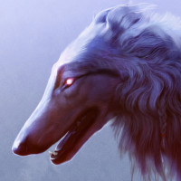 The image depicts a wolf. It has a large, intimidating presence with its fur being predominantly white and gray. The wolf's eyes are glowing red, giving it an eerie or supernatural appearance. This creature is standing on all fours in a somewhat menacing posture.