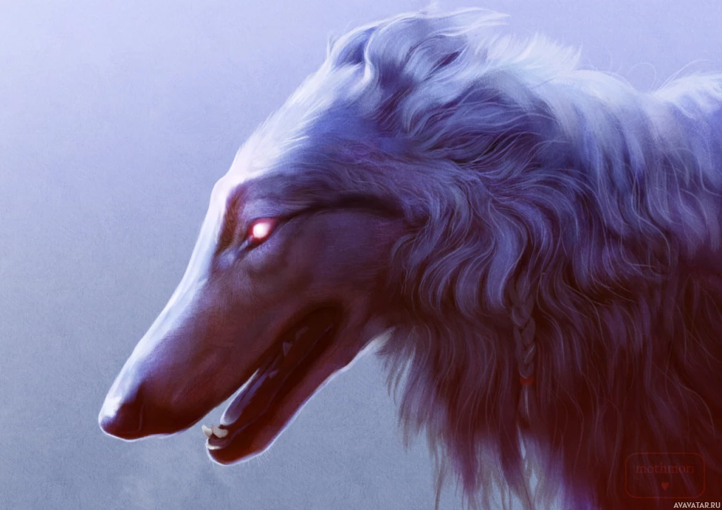 На картинке изображен волк. Он имеет большое, пугающее присутствие, его мех преимущественно белый и серый. Глаза волка светятся красным, придавая ему жуткий или сверхъестественный вид. Это существо стоит на четвереньках в несколько угрожающей позе.