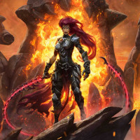 a rocky outcropping, surrounded by fiery rocks that suggest she may be in the midst of battle or navigating through a challenging environment. In her right hand, she holds