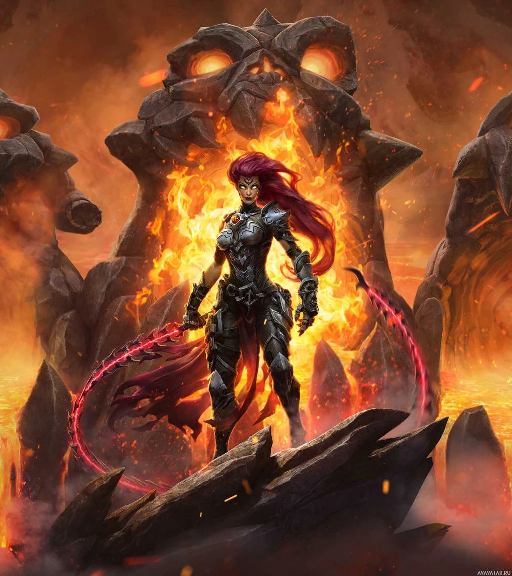 a sword upright, poised for combat, while her left hand rests on the hilt of a shield. The background features dramatic volcanic activity with smoke and fire, enhancing