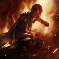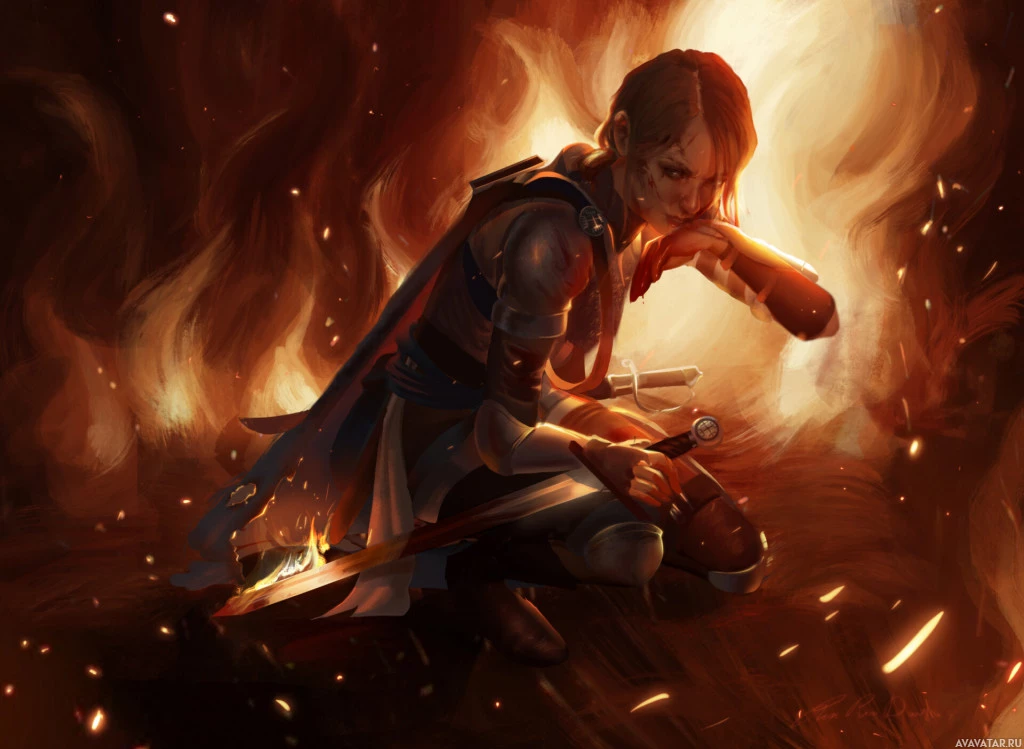the surrounding environment. Behind them is a background of flames and smoke, which suggests that the character might be in
