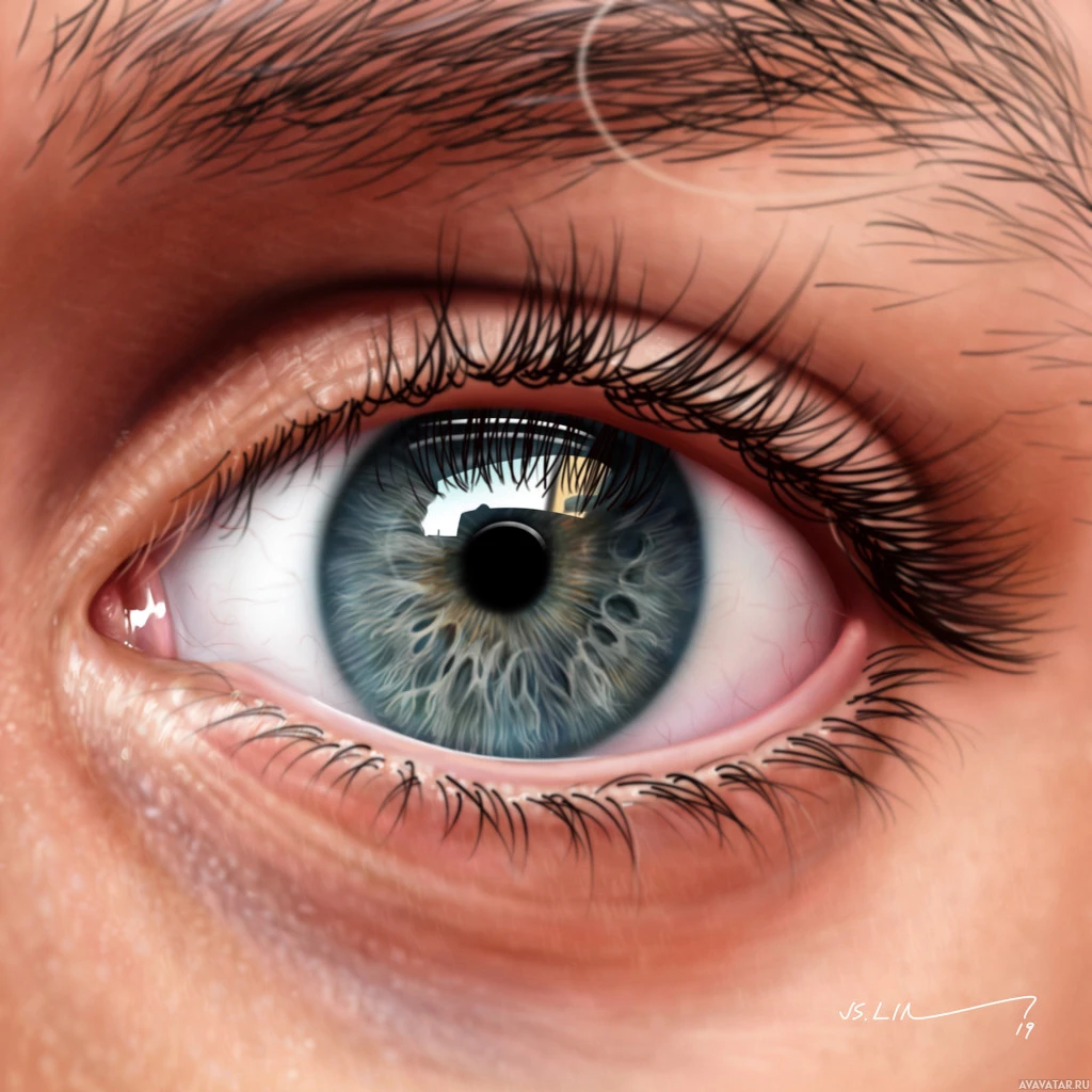 Изображение имеет крупный план глаза с подробными цветовыми градациями на радужной оболочке, что говорит о том, что радужка имеет градиент цветов. Это цифровое произведение искусства или иллюстрация, а не фотография человеческого глаза.