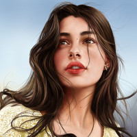На картинке изображено цифровое произведение искусства молодой женщины. У нее длинные каштановые волосы и она носит макияж, который включает красную помаду. Ее выражение кажется созерцательным или задумчивым, когда она смотрит в сторону с слегка расставленными губами. Она одета в желтый наряд с украшениями на нем. Фон представляет собой градиент синего и белого, создавая впечатление мягко освещенной среды.