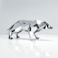 The image shows a sculpture of an animal, specifically a stylized version of what appears to be a bear or wolf. It is made from a material that reflects light, giving it a shiny and metallic look. The design has geometric shapes that contribute to its modern aesthetic.