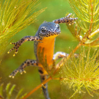aquatic habitat, likely near the edge of a pond or stream where it can live both underwater and on land. The salamander has brightly colored skin that might serve as camouflage against predators, with patterns and colors that help it blend into its surroundings. It appears to be in an active state, possibly walking or crawling through the water or along the shore, which is
