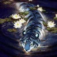 The image features a tiger in a serene and magical setting. The tiger, with its distinctive orange and black stripes, is lying down on
