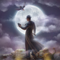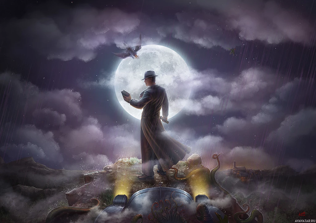 a full moon illuminating clouds that are dramatically swirling around it. Below the person's feet, there are glowing lights indicating some