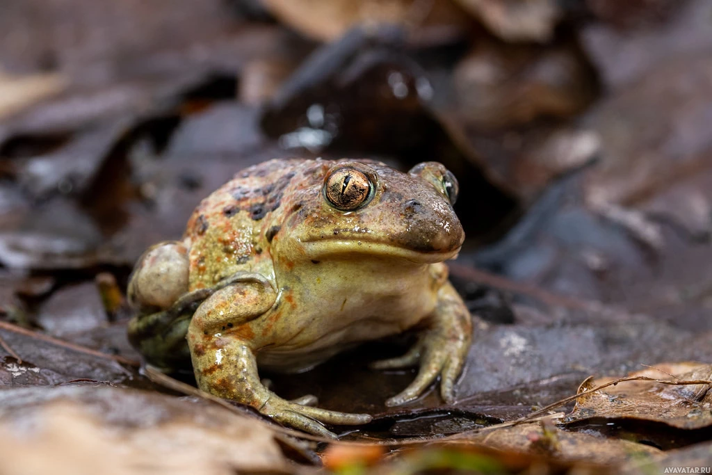 a small amphibian, specifically a toad or frog, sitting on what appears to be damp ground with leaves and possibly other debris scattered around. The creature is looking directly towards the camera, and it has