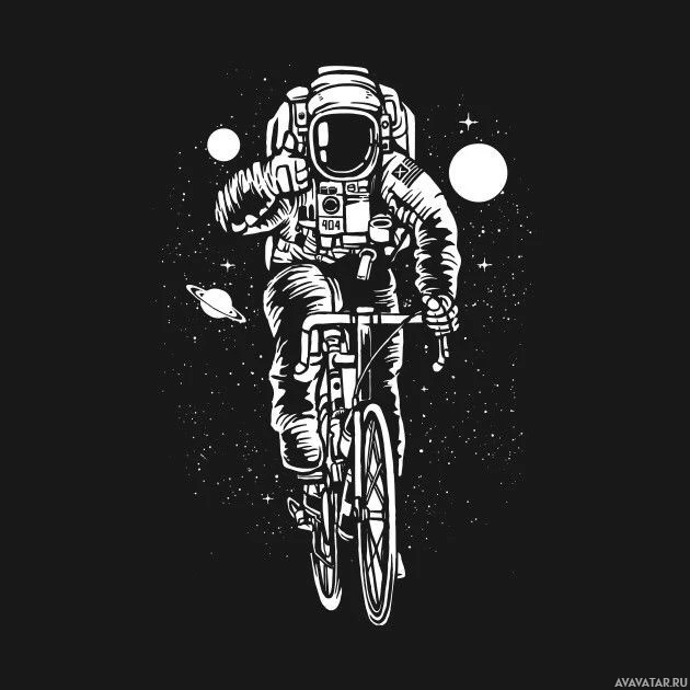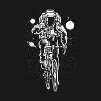 a black background which contrasts with the white outlines and colors used for the astronaut and bicycle, making them stand out prominently.