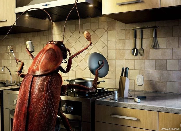 The image shows a cockroach, which is an insect, standing in a kitchen. It appears to be engaging in human-like activities such as using the stove and opening cabinets. The setting suggests