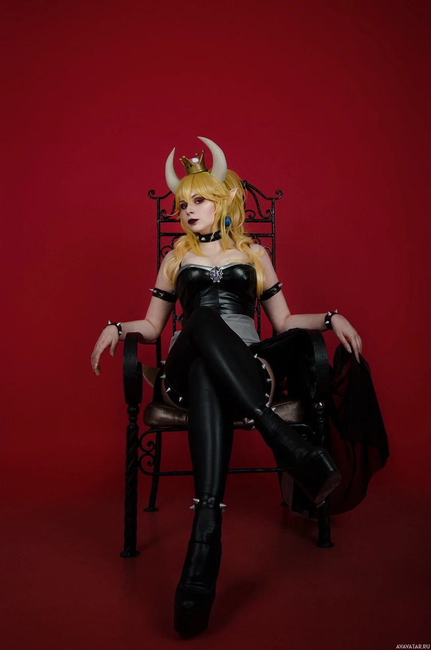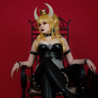 a cosplay costume that appears to be inspired by the character Bowsette from the Super Mario franchise, combined with elements of a dominatrix or bondage theme. The individual is wearing a black bodysuit with straps and buckles, a black choker around the neck, and has their hair styled in a manner that resembles Bowsette's iconic hairstyle from