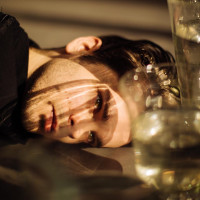 wine glasses around him, suggesting that he might be in a social setting, possibly after drinking some alcohol. He appears to have