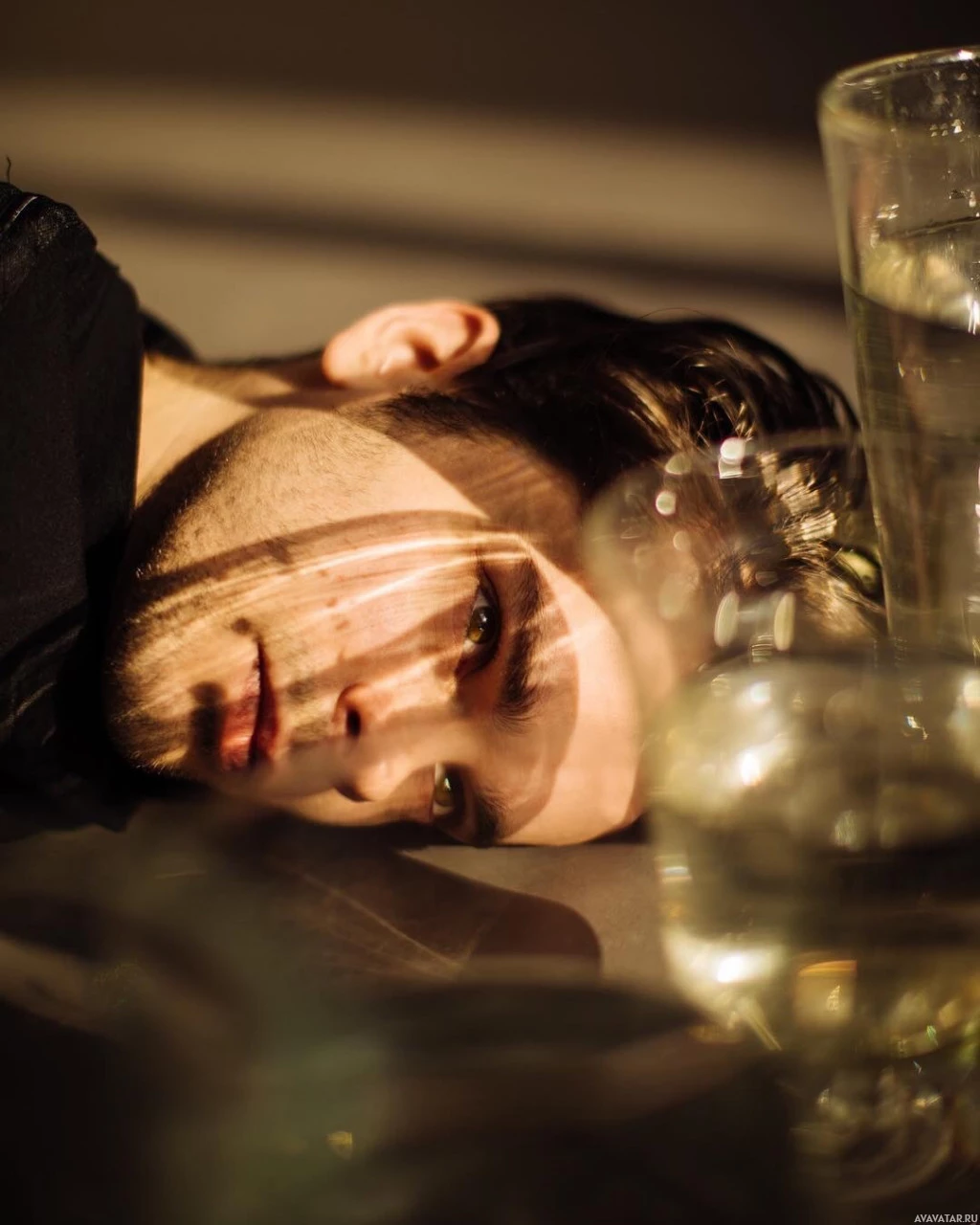a young man lying down, looking directly at the camera. His expression is neutral, and he has a contemplative or introspective look on his face. There are