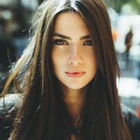 brunette hair, and she is wearing a black top with a lace detail on it. Her expression appears to be neutral or slightly contemplative. There are blurred elements in the background that suggest