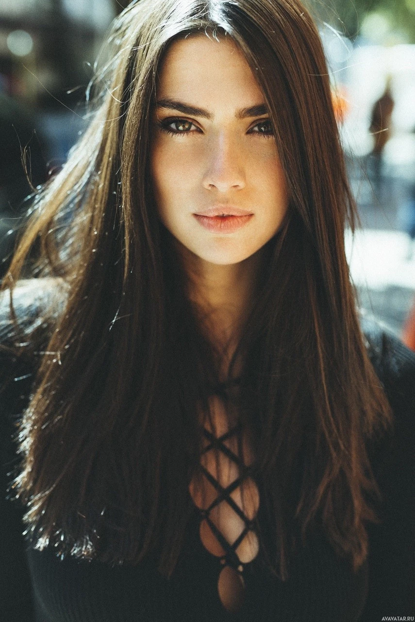 The image shows a woman posing for the camera. She has long