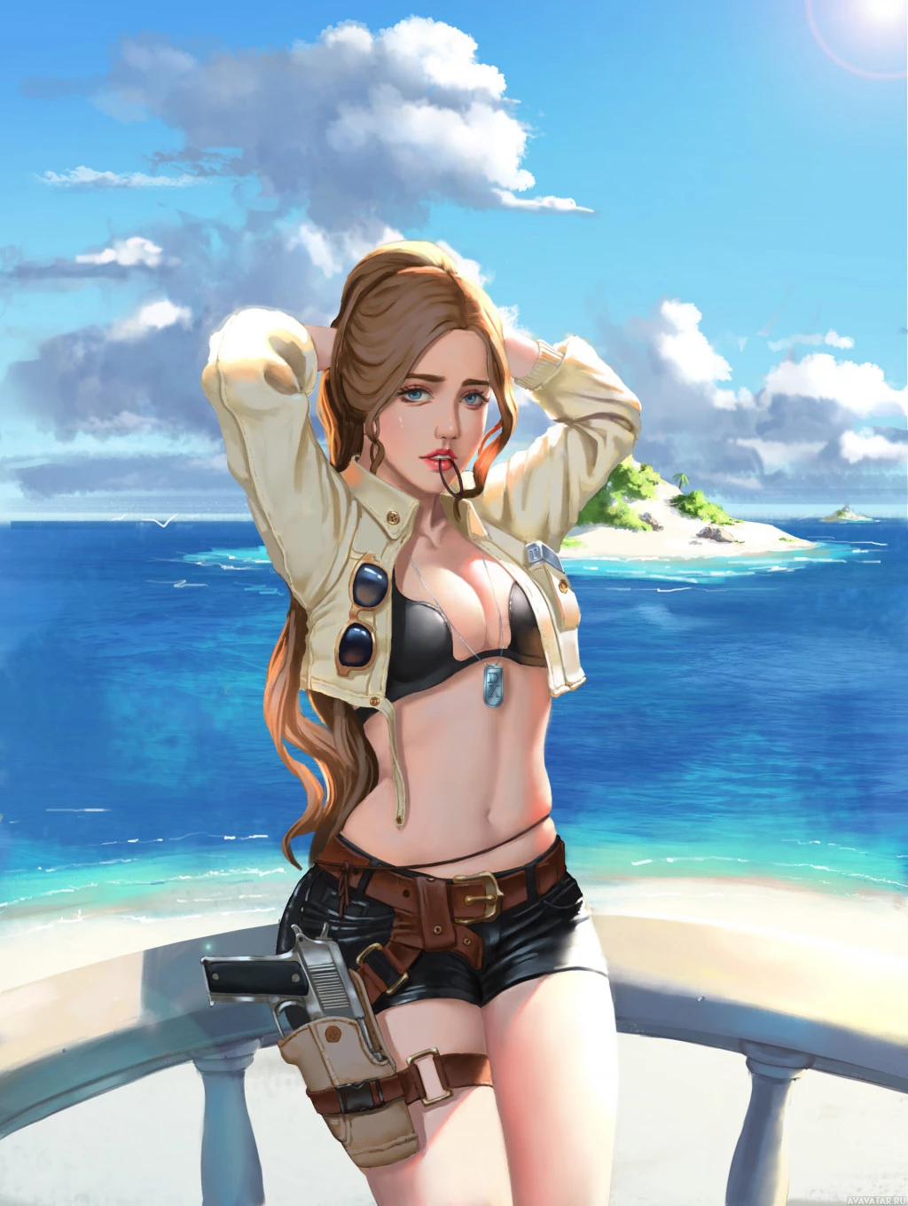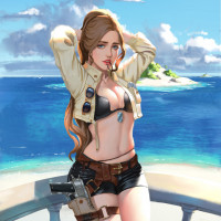 blonde hair, wearing a white jacket and blue shorts. In her hand, she is holding a pistol. The setting seems to be near the ocean or sea, as indicated by