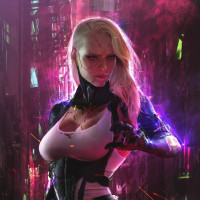 blonde hair, standing in a science fiction-themed setting. She is wearing black and white armor or a costume that appears futuristic in design, with glowing elements and what seems to be a high-tech gauntlet on her left hand. The background suggests