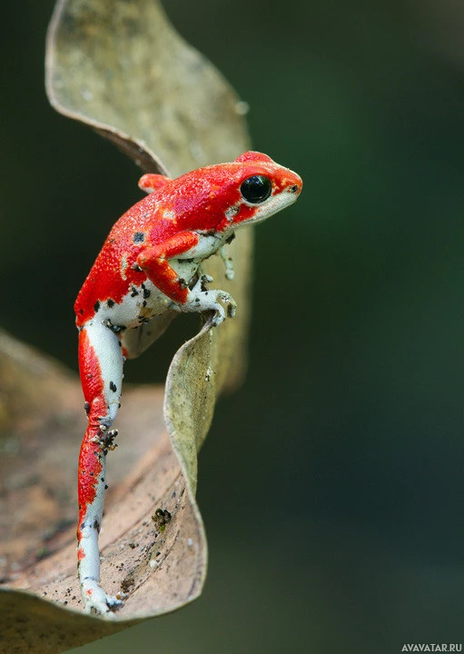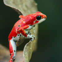 На картинке изображена маленькая красная лягушка с черными пятнами, расположенная на листе в тропической или субтропической среде. Лягушка отдыхает и, возможно, наблюдает за своим окружением.