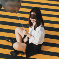 The picture shows a young woman sitting on the ground. She is wearing a shirt and skirt, and her hair is dark. She has a balloon in one hand. The background features yellow stripes, possibly indicating some form of parking or pedestrian zone.