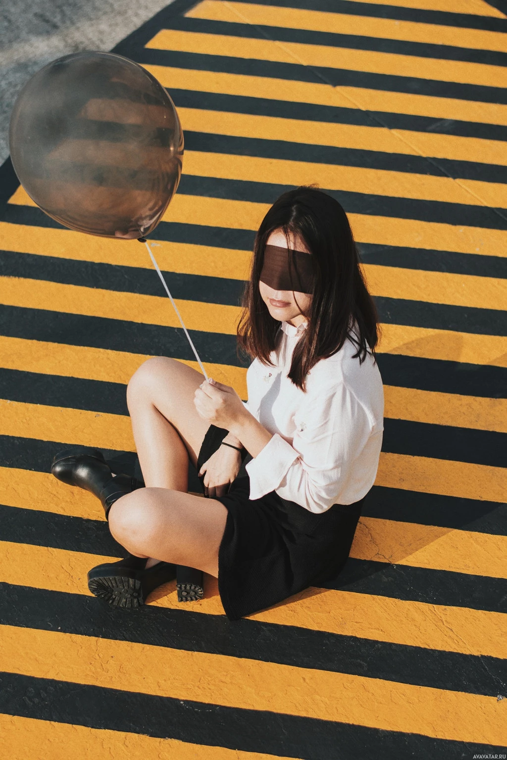 На фотографии изображена молодая женщина, сидящая на земле. На ней рубашка и юбка, а волосы темные. У нее воздушный шар в одной руке. На заднем плане изображены желтые полосы, возможно, указывающие на какую-либо форму парковки или пешеходной зоны.