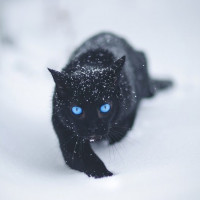 blue eyes walking through deep snow. It appears to be enjoying itself in the midst of
