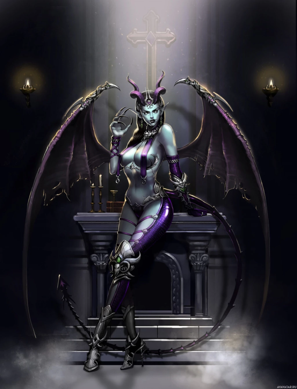 purple wings, horns, and tail, suggesting she is a creature from the demonic or mythical realms. She is seated on what seems to be a throne or an altar, with a cross in the background, which could indicate a religious or magical context. Her attire includes a corset-like top and