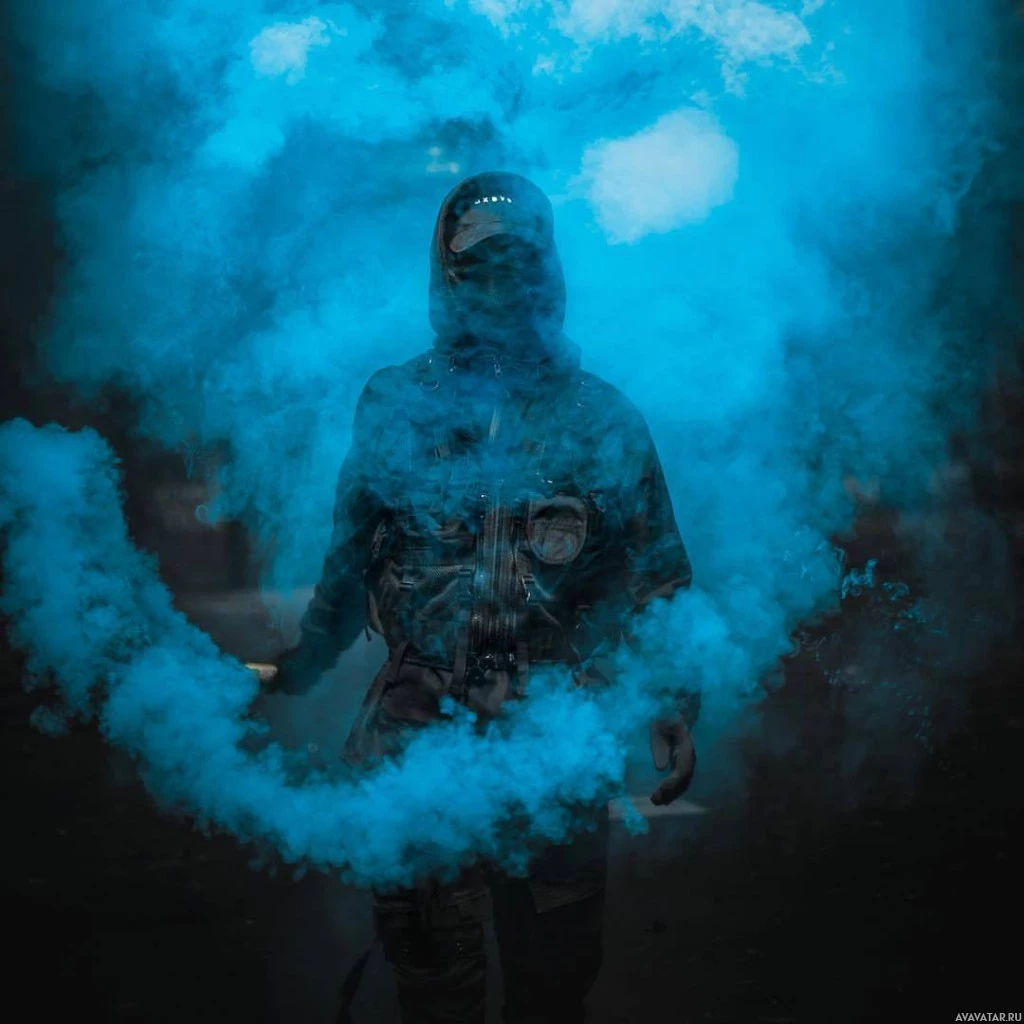 The image depicts a person wearing a hood and holding smoke in each hand. They appear to be outdoors at night, as suggested by the darkness around them. The smoke is blue and it seems like there might be some