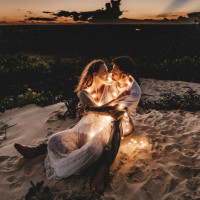 the beach at sunset. One person appears to be holding a string of lights, which suggests they might be sharing