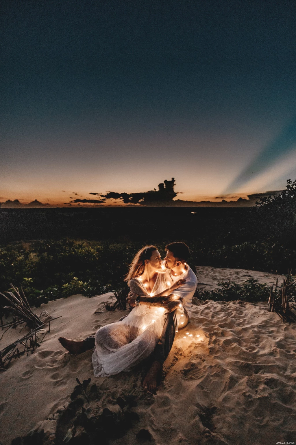 a romantic moment or simply enjoying each other's company as the day turns to night. The scene conveys a sense of tranquility and intimacy between the two individuals, enhanced by the soft glow of