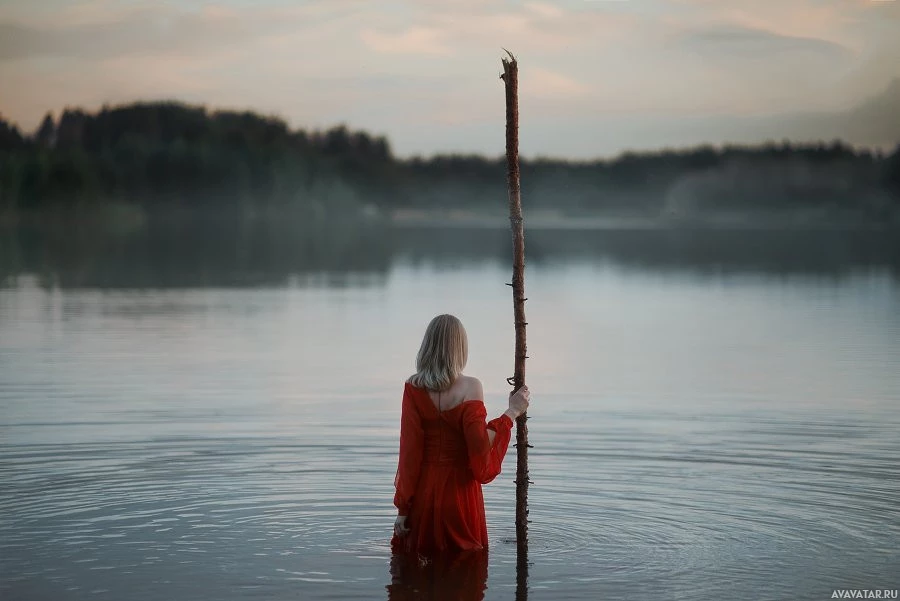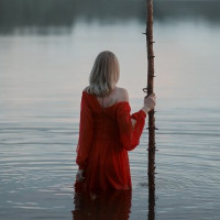 long hair and is wearing a red garment that could be a dress or cloak. The background features mist or fog over