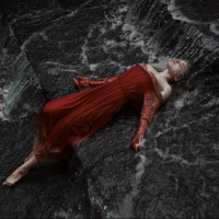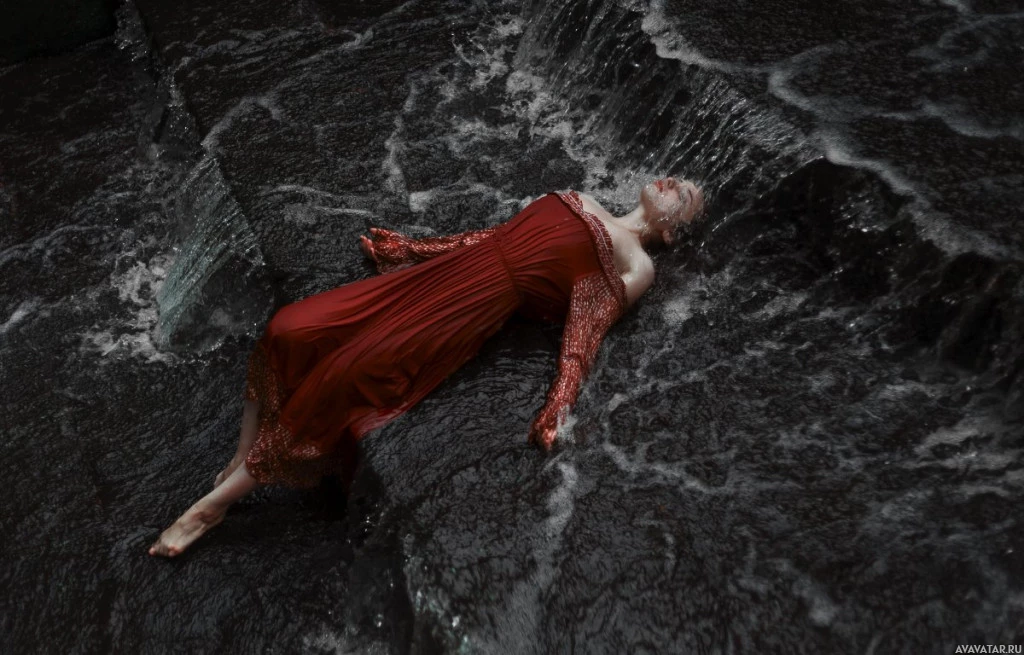 a red dress that seems drenched from the water, and her pose suggests she might have fallen into the water. Her expression is one of distress or exhaustion. The setting looks natural, with