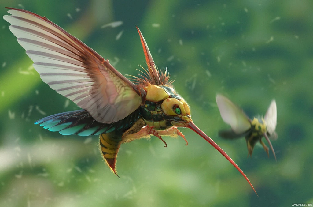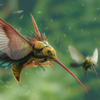 translucent wings and a body segmented like an ant or bee. The creature is shown in flight, with one wing outstretched to the side. Another smaller creature, which appears to be a butterfly-like flyer, is depicted in mid-flight nearby. The background suggests