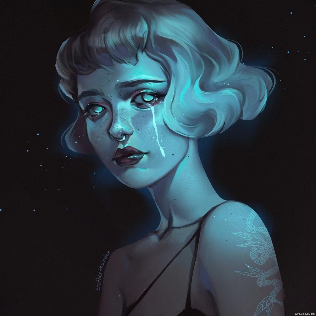 На картинке изображена женщина с белыми волосами, плачущая. У нее потрясающий макияж вокруг глаз и, похоже, она носит темный наряд или костюм, на руке которого есть какие-то отметины. Ее выражение — печаль или страдание.