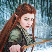 red hair, an elf-like appearance with pointed ears, and fantasy attire that suggests she might be a warrior or archer within the fantasy setting of Middle-earth. She is holding a bow and arrow, which are typical for her character's depiction in the films.