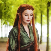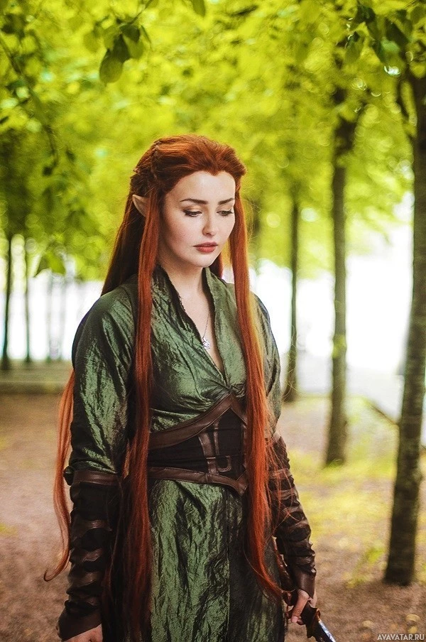 fantasy costume, emulating the character of Tauriel from the "Hobbit" series. They are wearing a green outfit with a corset-style top, and have