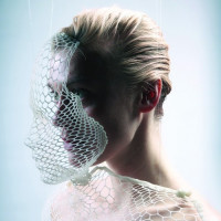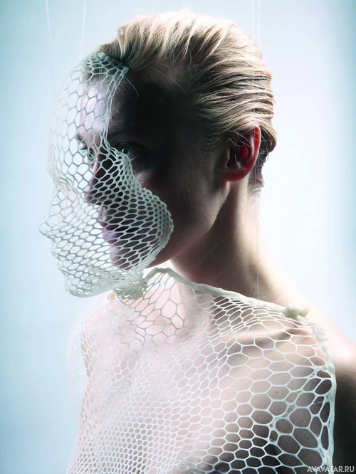 На снимке изображена женщина со светлыми волосами в белой маске над носом и ртом, скрывающая часть лица. Она, кажется, находится в помещении с отражающей поверхностью позади нее. Маска имеет сетчатый узор.