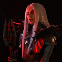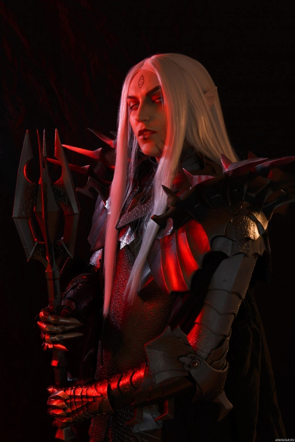 a fantasy character, possibly an elf given the context provided. This character is depicted in a striking pose with long