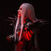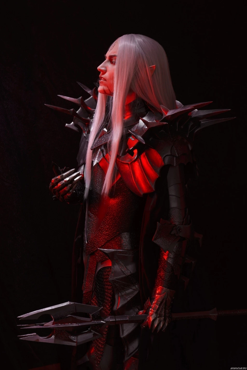 a red glow in the background which adds to the dramatic and otherworldly atmosphere of the image. The setting suggests this could be from a cosplay event or a themed photoshoot, where individuals dress up as characters from fantasy genres such as