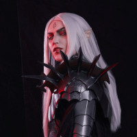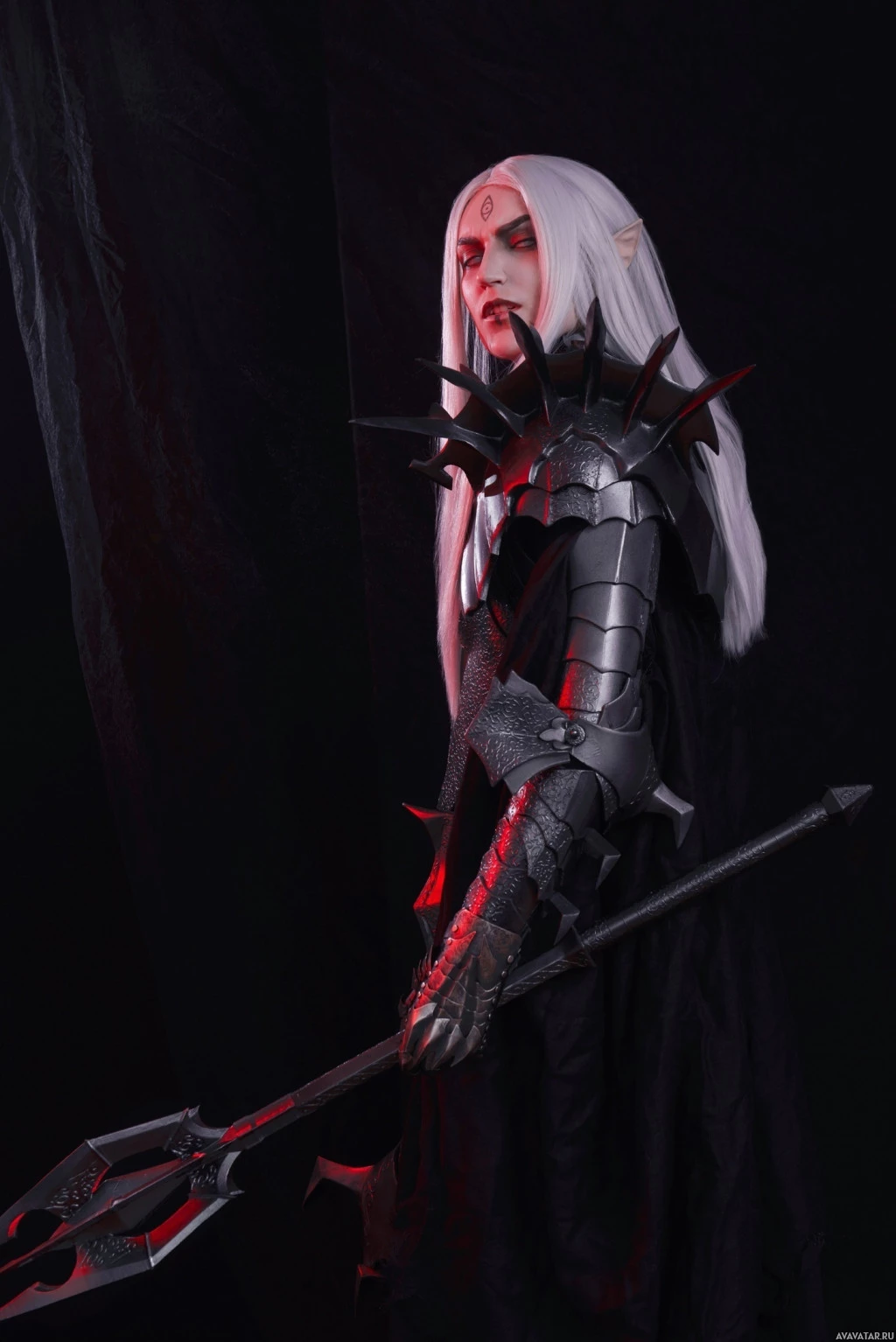 a curved blade at one end and a skull-like ornamentation near the top of the staff. The background is dark, which contrasts with the character's lighter skin tone and white hair, highlighting their presence. This costume suggests that they are portraying an elf from a fantasy or role-playing game context.