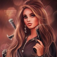 long hair and is holding a pistol with both hands, pointed slightly upward towards the top right corner of the image. She appears to be styled in a fashionable manner, wearing what seems to be