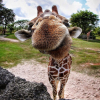 На картинке изображен жираф, стоящий на том, что кажется песком или грунтом. Жираф обращен к камере, и его рот открыт, как будто он зевает или реагирует на что-то. На заднем плане есть зеленые деревья, что говорит о том, что это может быть естественная среда обитания или парк дикой природы.
