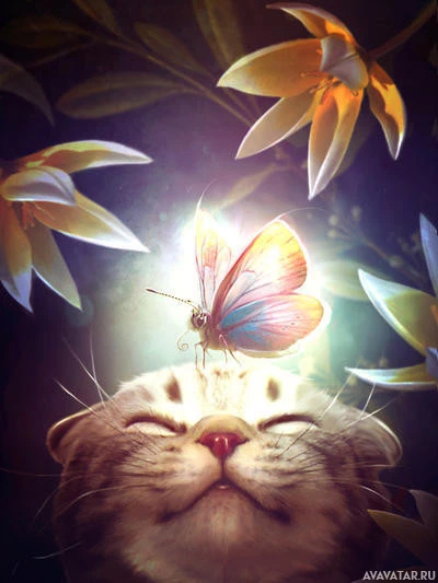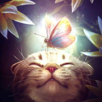 an ethereal atmosphere. The cat seems to be enjoying the presence of the butterfly, which suggests