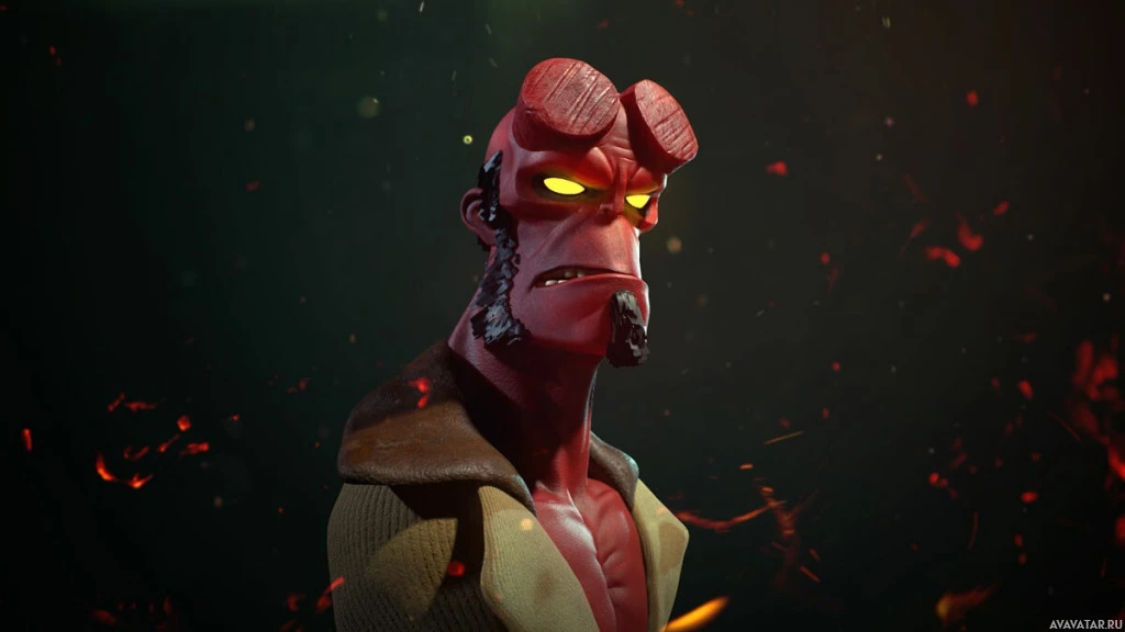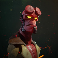 the Hellboy series. The figure is wearing red skin and has horns, which are characteristics of the main antagonist of