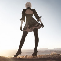 На данной картинке изображена женщина-персонаж из видеоигры «Nier: Automata», уходящая вдаль. Персонаж изображен с альтернативным нарядом, который отличается от ее обычного наряда в игре, предполагая, что это может быть косплей или изображение персонажа.