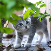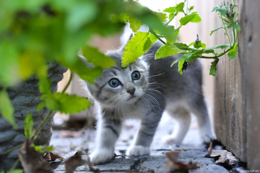 На снимке изображен молодой котенок с голубоглазым выражением, выглядывающий из-за зеленой листвы. Это кажется любопытным или осторожным в отношении чего-то за пределами кадра картины.