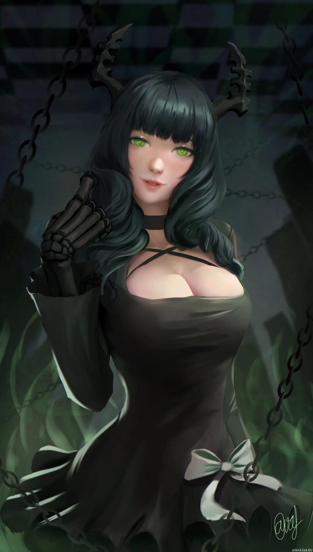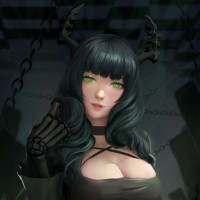 a black dress with a bow and is adorned with what appears to be demonic horns or ears, suggesting she might be portraying a character inspired by mythical or supernatural elements. The background is somewhat eerie, with dim lighting and shadowy figures that contribute to