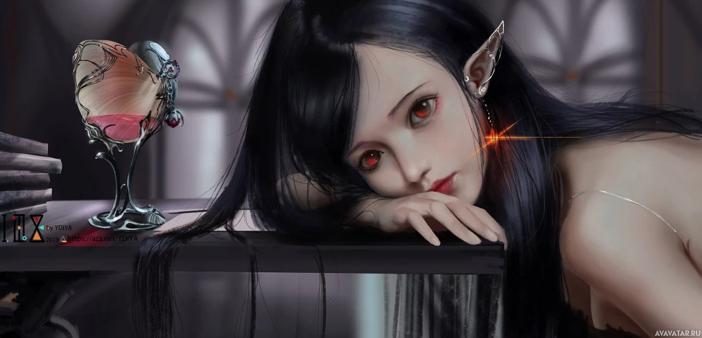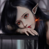 a female character with elven-like features. She has pointed ears and her appearance suggests she might be a vampire or a similar supernatural creature from