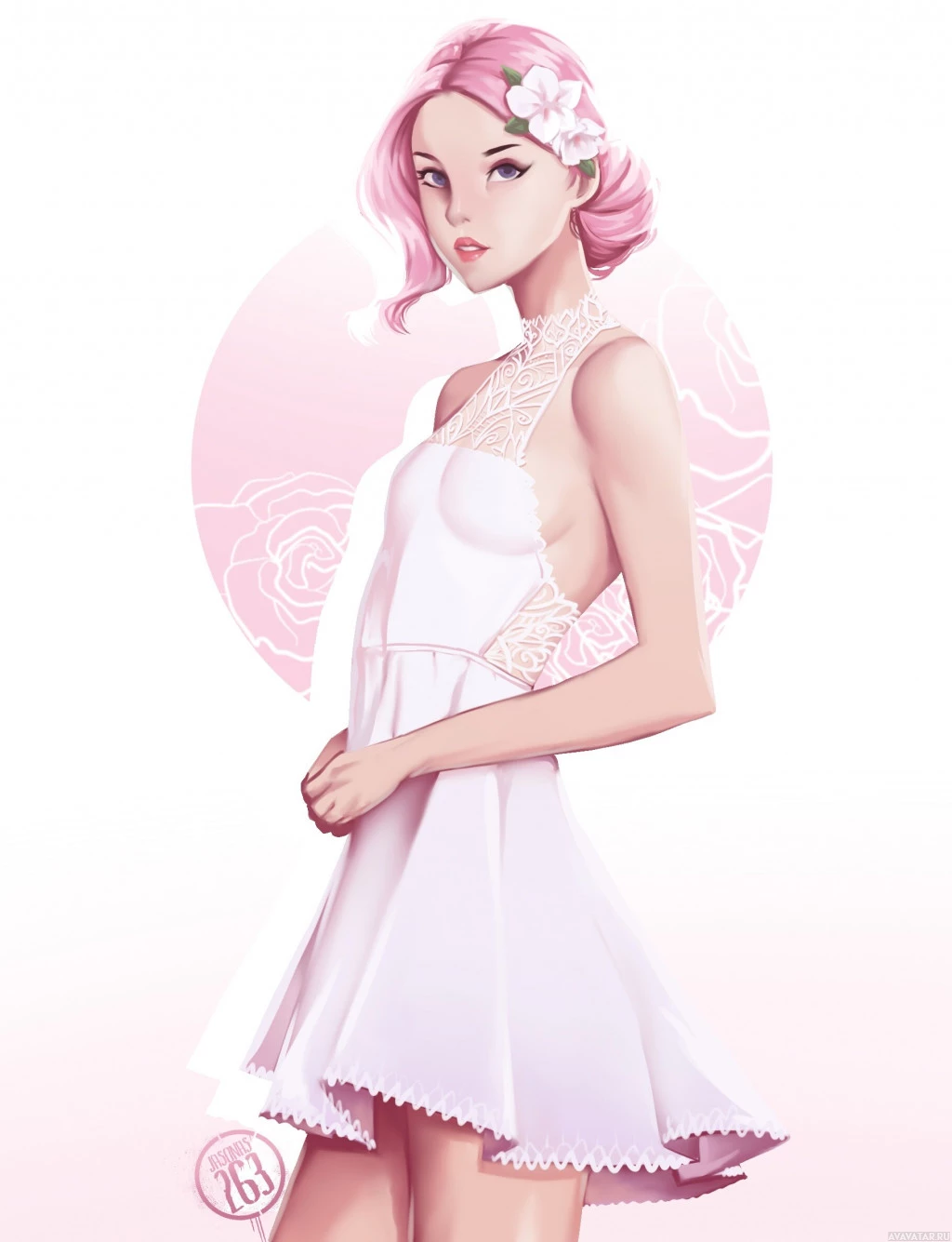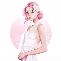 a floral accessory in her hair and is wearing a light-colored, lacy dress that appears to be adorned with rose patterns. The background features a minimalistic design with