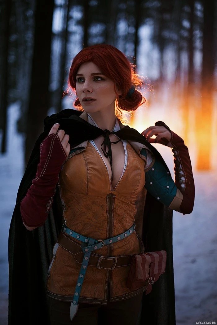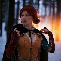 Triss Merigold, portrayed by actress Anna Shaffer in the Netflix adaptation of the game. She is depicted wearing her costume from the series, which includes an outfit that appears to be inspired by