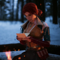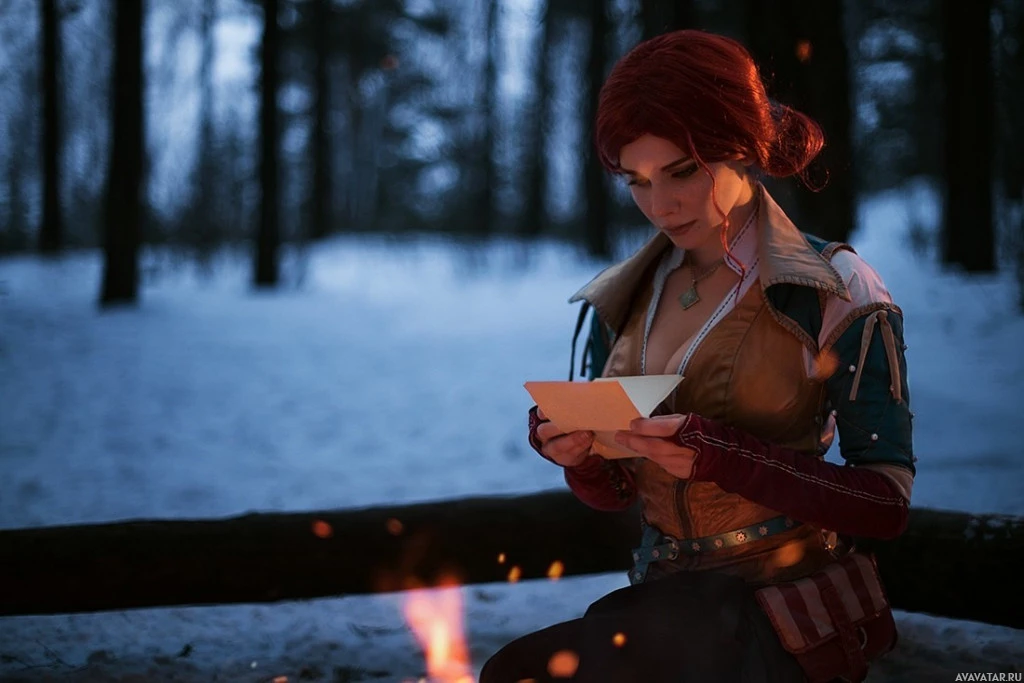На снимке изображена героиня по имени Трисс Меригольд из видеоигры «Ведьмак 3: Дикая Охота». Она изображена в стиле косплея, что означает, что кто-то одет, чтобы напоминать персонажа. Трисс является волшебницей и играет важную роль в сюжетной линии игры. Ночью обстановка кажется зимним лесом, добавляющим мистическую атмосферу.